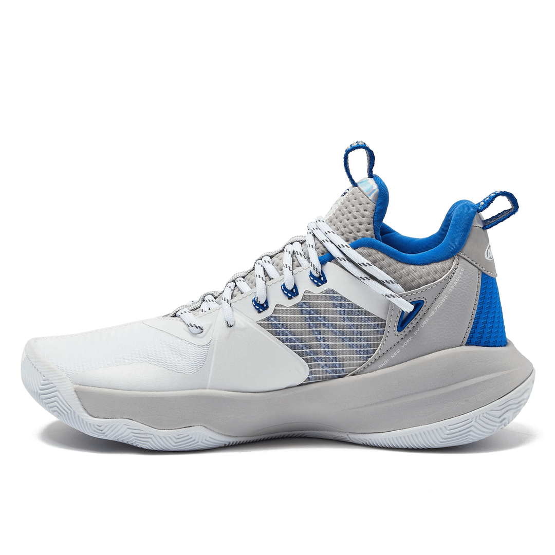 Perfect for basketball practice or casual wear, these shoes combine style and performance. The sleek white and silver grey design makes them a fashionable choice for any young athlete looking to stand out on and off the court.