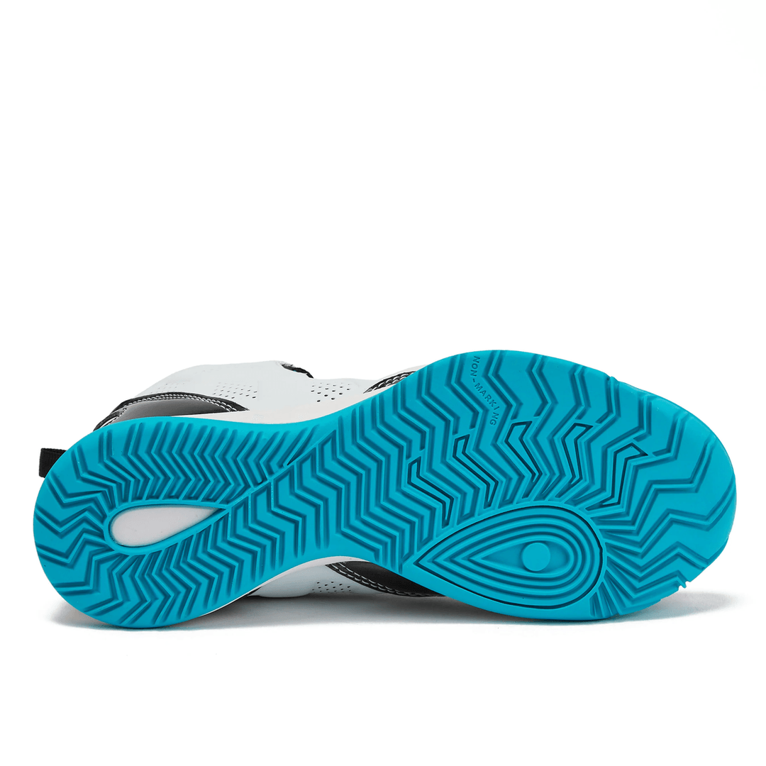 Featuring a stylish design, these sneakers are not just functional but also a fashion statement. The vibrant aqua blue accents against the classic white and black make them an eye-catching choice for any young athlete.